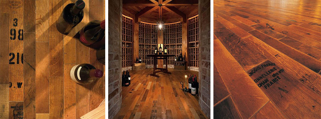 A client favorite, this wine barrel wood represents the top of the barrel with all of its original patina, cooper’s stamps, and special markings. No two pieces of wood are exactly alike, bringing such a rich and unique quality to your space. Cooperage wine barrel wood is commonly used as flooring, bar tops, feature walls, and more. Below are some of our favorite projects using this particular product.